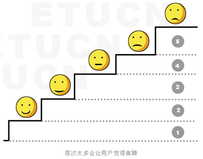 纵向太深,用户会在一层一层挖掘后,感觉焦躁,同时也容易迷失。横向太宽,信息量多了,用户会觉得复杂,找不到自己想要的东西。