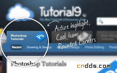 在大多数情况下,博客导航放在页面的同时将分类作为第二导航放在页面的边栏。Tutorial9做了一件了不起的事情,他把浏览者关心的photoshop资源以生动的方式展现出来了,并且在鼠标经过二级导航的时候有一个高亮效果。