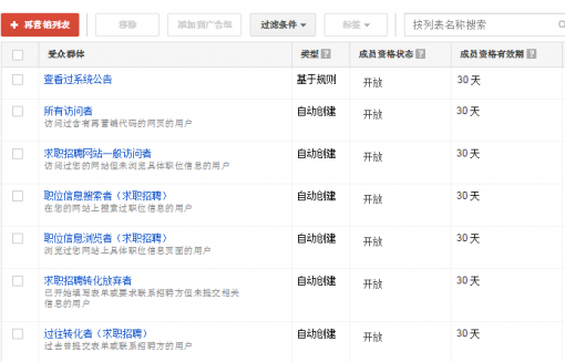 在AdWords中,第一种方式是让AdWords自己来收集受众集体列表,这种办法需要你手动将代码放置到各个页面中。假定你运营的是一个招聘网 站,那么你能够把所有浏览过Java工程师职位的访客通过他们是否浏览过Java工程师职位页面来进行标记,代码就会放置到这些页面中。一般来说咱们会在 所有页面中插入一段AdWords代码并操控代码中的参数以区别不同访客特征。这样你在再营销的基础上就能够进行再推行动态广告。如上图所示,谷歌会 自动为“求职招聘”创立5个自动生成的再营销列表。此外你也能够自界说一些“基于规则”的再推行列表。通过这个设置,你就不会为Java工程师推送财务相关的职位了。