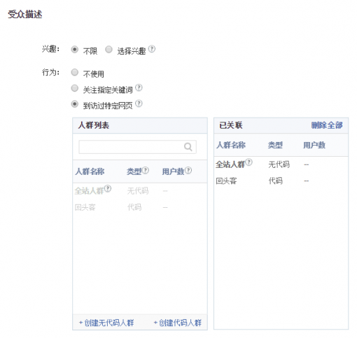 baidu推广中的再推行两年前从前有着一个本地化的名字“回头客”。在baidu网盟推行中,新建推行计划时,选择“受众描述”-“行为”,选择 “到访过特定网页”。这样你就为该推广计划开启了再推行。接着baidu会让你选择“创立无代码人群”,“创立代码人群”。前者是baidu的“黑科技” 即baidu无时不刻在搜刮的用户拜访记录(数据来源可能是搜索,baidu浏览器等)。后者是和谷歌一样的通过代码来收集。但因为不支持变量,假如 有多个标记而不是通过URL来辨认时需要重复安装。baidu也支持自家的baidu统计代码,只是现在也只支持URL。