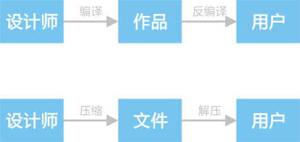 此过程借用计算机的说法是对文件的压缩和解压,设计师和用户无法直接对话,需以“文件”为媒介,设计师将文件打包压缩,用户在接到“文件”时解压文件之后方可理解设计师的意图,解压的密码是设计师和用户对于元素的声明,如声明红色表示热情,如何声明基于设计师和用户如何在认知上达成共识。