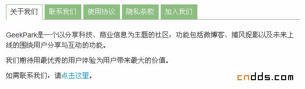 极客公园的“关于”上方鲜明地标上四个标签,扰乱视听不说,这四个页面还是单独的html文件,网站的速度又令人崩溃。还有更不爽的:它压根就没讲清楚极客公园到底有何与众不同。——这与网站的创办者之一,可能吧的作者,在博客里的清晰的描述(他写到:极客公园,我们团队它的定位是:IT、商业资讯精读社区)形成鲜明对比。如图05。(最后一行的“联系我们”和第二个标签重复了)
