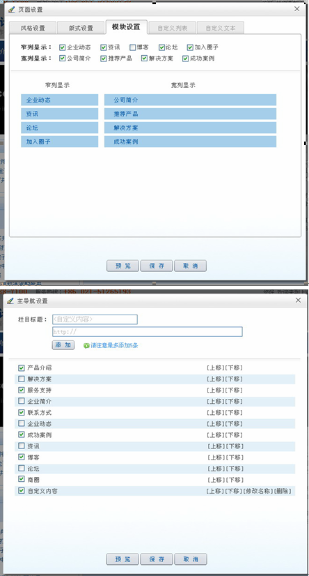 1.增加解决方案,联系方式,企业动态等模块,细化服务功能2.增加界面的统一感,banner的通栏设计3.强化首页的产品模块,突出业务主线4.解决方案的首页模块,突出产品服务5.成功案例的模块强化,同样是业务主线的凸显6.弱化企业动态,博客,圈子等辅助功能7.左右结构统一化, 让用户浏览更流畅8.强化菜单的设计和导航的作用4.后台控制页面后台的设计主要强调其功能性,我们借鉴了博客网站的模版修改功能,主要在模块的增减,色彩方案的选择和调整的直观性上做设计。