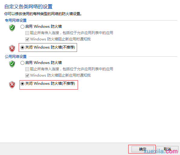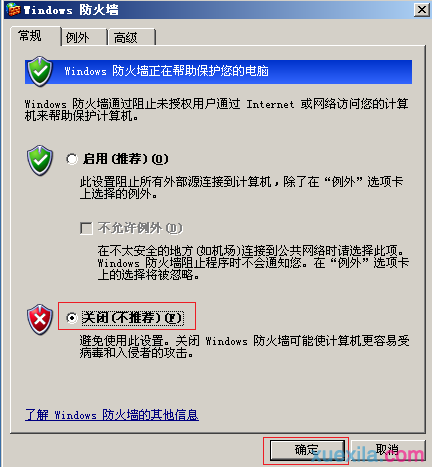 选择关闭Windows防火墙后,点击 确定,即可成功关闭系统自带防火墙。