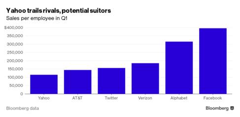尽管成本不断增加,雅虎每个员工的生产效益却落后很多。谷歌的母公司Alphabet Inc,每个员工平均创造收益315948美元;Facebook的员工平均每人创收400000美元;运营商Verizon平均每个员工创收185637美元,AT&T则为144319美元,而雅虎却只有116000美元。分析师认为,目前这种状况下雅虎仍需裁剪3000名左右的员工,届时雅虎将成为S&P 500里规模最小的企业。