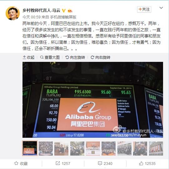 马云微博原文:两年前的今天,阿里巴巴在纽约上市。我今天正好在纽约,感慨万千。两年,经历了很多该发生的和不该发生的事情,一直在践行两年前的信任之旅,一直在信任和误解中挣扎,一直在相信相信。感恩所有给予阿里信任的同事和朋友们。因为信任,所以简单;因为信任,唯恐辜负;因为信任,才有勇气;因为信任,还会不断折腾自己。。。