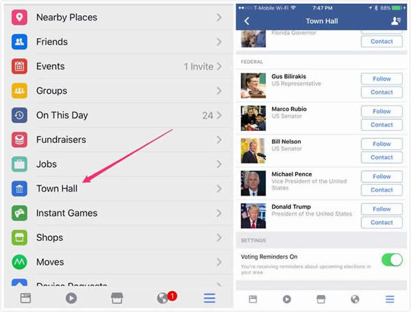 美国的用户在“市政厅”的功能页填写完自己的地理位置信息之后,可以看到当地政府官员的名单,包括美国众议院和参议院的官员、用户所在地区的州立法机构机当地州长、地方议会成员及市长等。