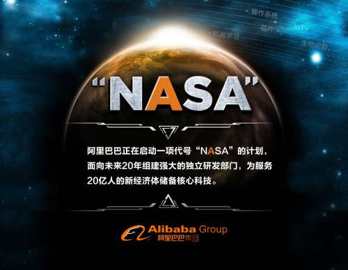 3月初,阿里巴巴董事局主席马云宣布启动内部代号为“NASA”的计划,将面向未来 20 年组建强大的独立研发部门,建立新的机制体制,为服务 20 亿人的新经济体储备核心科技。