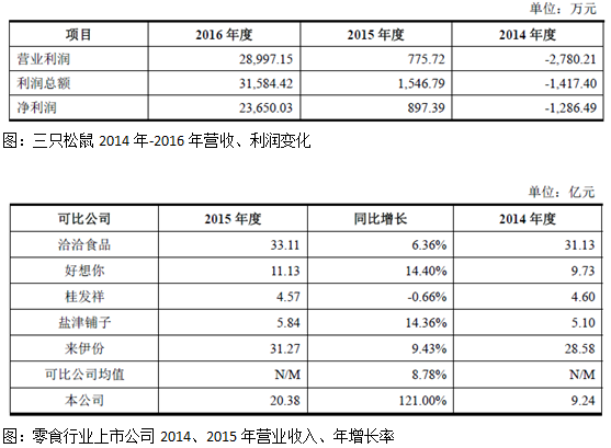 之后,不断再接再厉, 2015 年,三只松鼠营收为204,306. 20 万元,较 2014 年增长121.00%,净利润为897. 39 万元; 2016 年,营收为442,269. 62 万元,较 2015 年增长116.47%,净利润为23,650. 03 万元。连续两年增长率保持在100%以上,大幅领先同业竞争对手,成为极其引人注目的网红快消品。