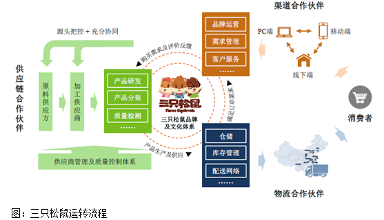 生产:生产环节,由三只松鼠的合作加工厂完成;