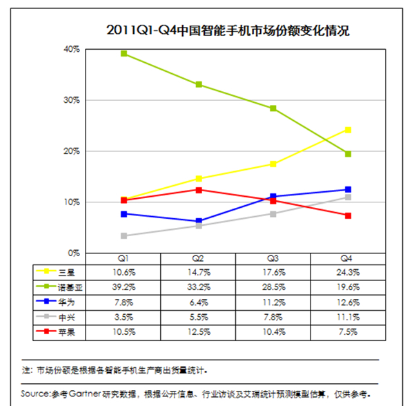 可以发现,2011 年的手机市场主宰者是功能手机,压根就没有智能手机太多的事情,而当时全球第一大手机厂商则是早已淡出我们视野的诺基亚。那时候的中国企业呢,倒也的确看到了市场未来的方向,于是像华为、中兴这些企业,纷纷通过与运营商合作推出定制机的模式占领国内大部分的中低端市场。