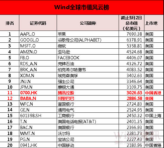 Wind全球市值“风云榜”显示,截止 5 月 2 日,全球市值Top10 中前五家均被科技公司霸占。腾讯和阿里巴巴位列第 11 和 12 名,阿里巴巴当前的市值约为2886. 58 亿美元,中国互联网巨头,大有赶超前人之势。