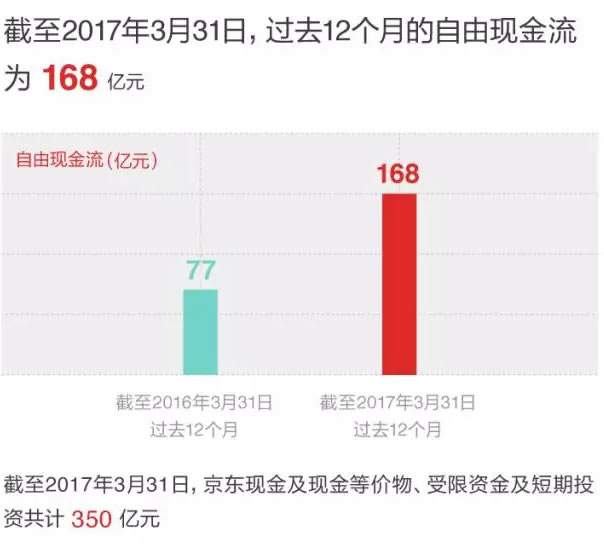 截至2017年3月31日,京东过去12个月的经营现金流为102亿元人民币,同比增长405%;截至2017年3月31日,剔除经营现金流中包含的京东金融相关影响,京东过去12个月的自由现金流为168亿元人民币,同比增长120%;截止2017年3月31日,京东现金及现金等价物、受限资金及短期投资共计350亿元。