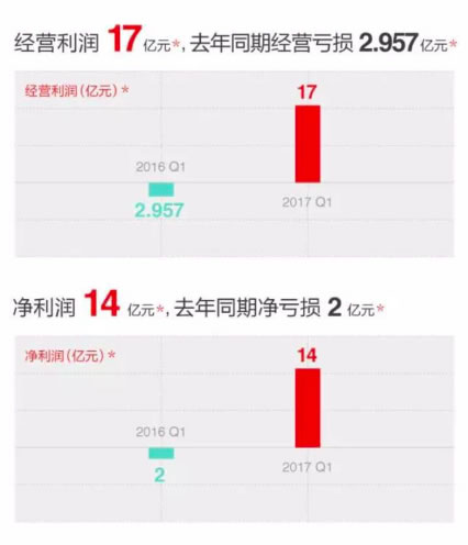 2017年第一季度非美国通用会计准则下净利润为14亿元人民币,去年同期非美国通用会计准则下净亏损为2亿元人民币。