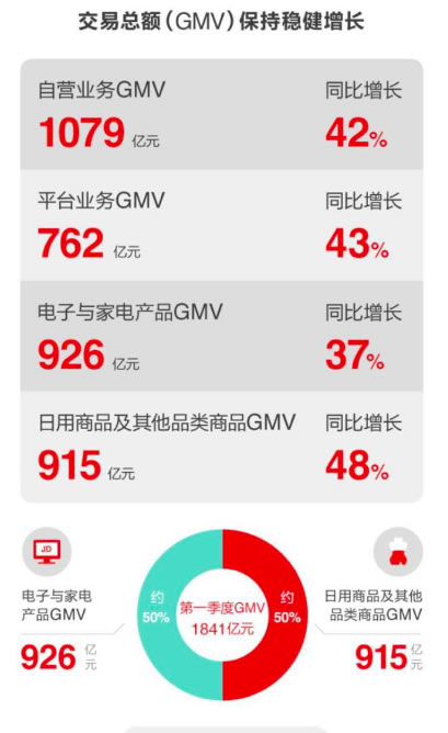 在1841亿元的交易总额中,电子家电产品的GMV与日用商品及其他品类商品GMV约各占50%的比例,分别达到了926亿元和915亿元。