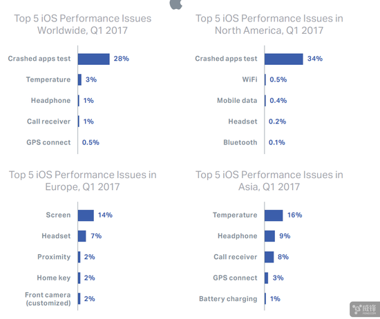 通过报告继续了解,iPhone 故障率高的原因在于应用程序崩溃情况比 Android 手机高出近三倍。第一季度 iOS 应用程序崩溃的故障率高达 28%,而 Android 智能手机仅为 10%。另外,很多 iPhone 用户碰到其他问题,例如 3% 设备有 GPS 问题,0.5% 用户有过热的问题。而 Android 手机则集中于信号(6%)和摄像头故障(3%)。