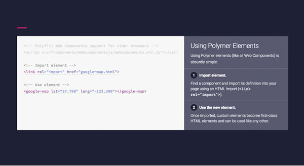 而这就是Web Components所能做的事情,但是现在很多设计师都没有用它把自己给武装起来。而现在谷歌Material design就是一个很好的开始,它提供了丰富的动画和交互方面的组件,用户只需要简单几行代码就能进行使用。