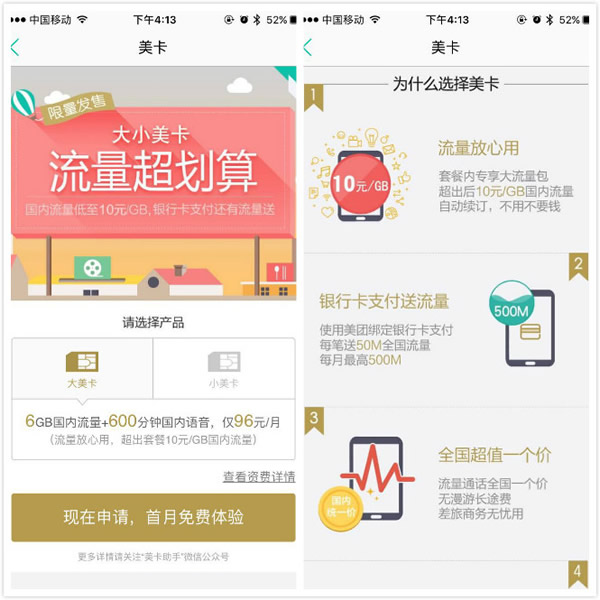 另外,大小美卡用户使用美团也可获赠流量,在美团、美团外卖、猫眼等客户端使用银行卡支付每笔可获赠 50M 全国流量,每月限 10 笔,满 100M 可兑换至相应手机号。普通联通用户在美团使用银行卡支付每笔可获赠 10M 全国流量,每月限 10 笔。