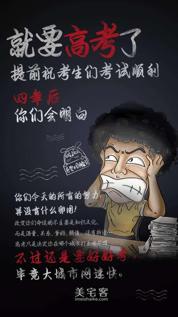 6 月 7 日/ 8 日就要高考了,提前祝考生们考试顺利。 四年后你们会明白 你们今天的所有的努力,并没有什么卵用!改变你们命运的不主要是知识文化,而是酒量,关系,胆量,爹妈,颜值,还有你们村是不是要拆迁…高考只是决定你在哪个城市打王者荣耀,不过还是要好好考 ,毕竟大城市网速快。