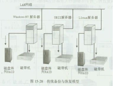 传统的备份与恢复模型主要特征是,每台特定主机服务器都配有专门的磁盘和磁带系统,每台主机都将自己的数据备份到本地连接的磁带机或磁带库上,这实际就是DAS直接连接存储方式。这种设计对磁带资源的利用率比较低,因为即使某台服务器的磁带机空闲,其他服务器也无法使用它。另外,这些备份设备直接连接在服务器上,需要占用较大的服务器资源。这种备份通过需在晚上没有太多人上网的情况下进行。