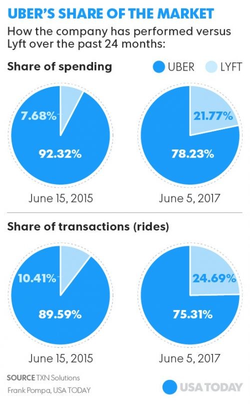 TXN Solutions,一家根据信用卡收据创建销售估算的公司,根据其调研数据,在过去两年中,Uber的市场份额从90%下降到75%。根据《今日美国》公布的数据,最后3%(78.8%—75.3%)的滑落发生在苏珊•福勒(Susan Fowler)发表博客的2月中旬和6月的第一周之间。