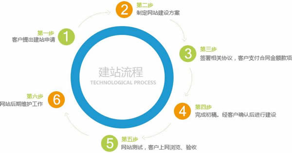 客户提出需求→设计建站方案→查询申办域名→网站系统规划→确定合作意向→网站内容整理→网页设计、制作、修改 →网站确认并发布→网站推广维护。