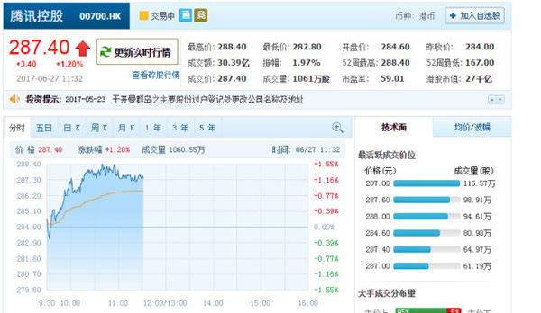 6 月 27 日,腾讯控股(00700.HK)今日的开盘价为284. 60 港元,随后一路震荡上扬,截止早间收盘,腾讯控股报287. 40 港元,上涨1.2%,股价再创历史新高。市值达2. 7 万亿港元,约合 3462 亿美元。