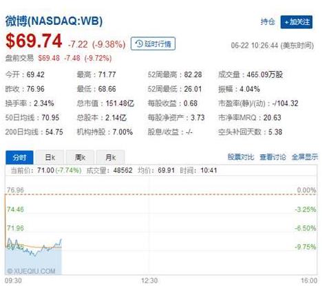 该消息出来后,微博美股存托凭证盘前大跌逾10%,开盘半小时内跌约10%;新浪ADR盘前跌逾8%,开盘不到半小时跌进7%。