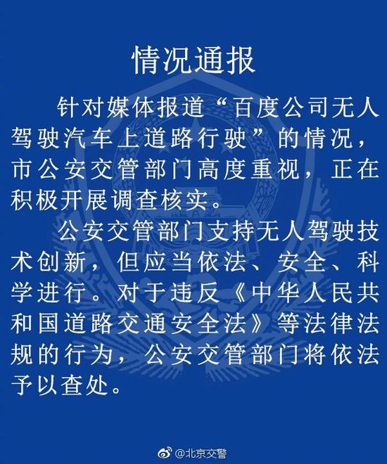 北京交警官方微博称,正在积极开展调查核实。支持无人驾驶技术创新,但应当依法、安全、科学进行。对于违法违规行为将依法予以查处。全文如下: