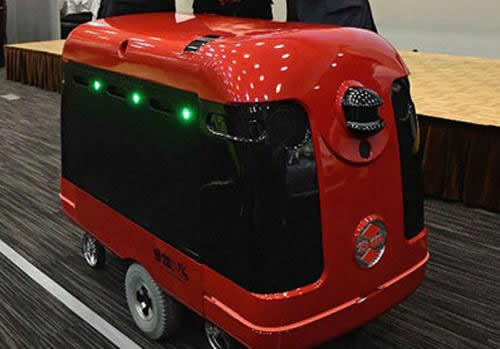 ZMP在东京举办的“ZMP论坛”上发布了这款快递机器人。如图所示,这款机器人像一个带车轮的大箱子,并配备了快递盒。