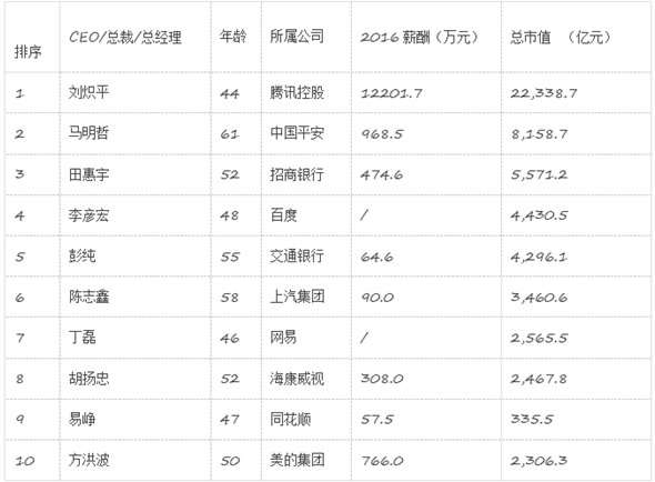 从榜单来看,IT企业中,腾讯控股CEO刘炽平排名第一(年薪1. 22 亿),百度CEO排名第4,网易CEO排名第七。