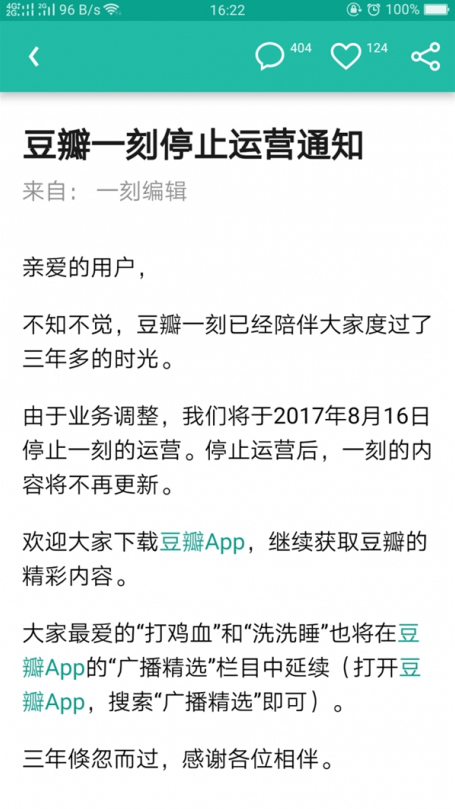 近日,豆瓣一刻宣布,经过三年多的发展之后,宣布于 8 月 16 日开始停止运营。