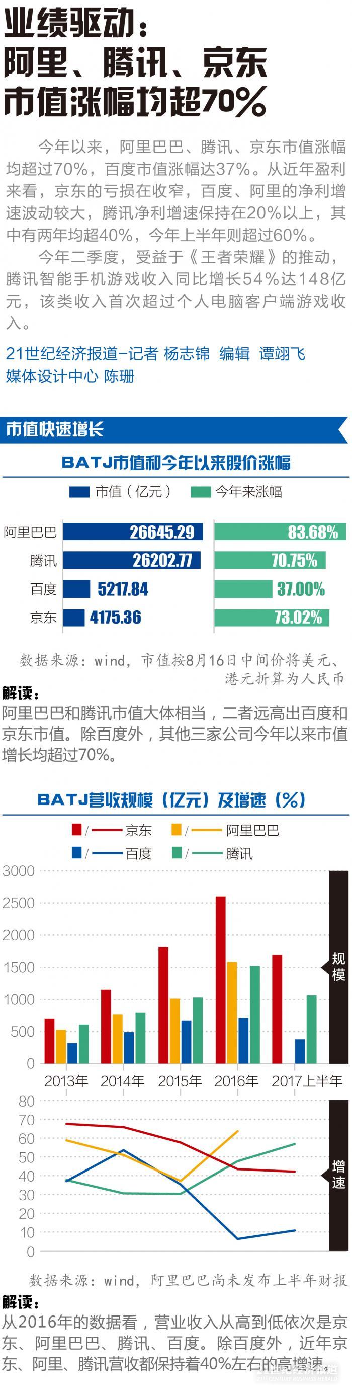 今年以来,阿里巴巴、腾讯、京东市值涨幅均超过70%,百度市值涨幅达37%。
