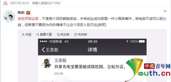 不想,这一举措竟引来了王思聪的“强怼”:“共享充电宝要是能成我吃翔,立帖为证。”王在微信中说到。对于外界质疑,陈欧倒显得信心满满,在转发王思聪的微信并表示“谢谢思聪监督”后,他又公开谈起共享充电宝的项目:“共享充电宝本质解决的是人的焦虑问题,卖的是安全感。我觉得未来光是充电宝业务自己发展,半年内很可能价值超过任何垂直电商,这是我believe in的。”一个月过去,街电取得了一定的成绩。