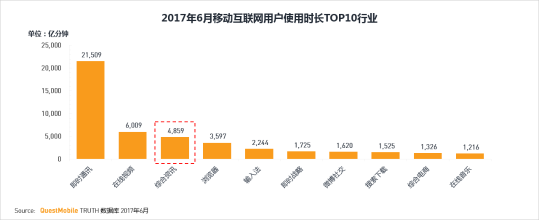 不难发现,在人口红利逐步减少的背景下,能够占领用户使用时长才能进一步获得用户价值,因而用户使用时长成为重要考量标准。对比移动互联网各行业,综合资讯行业已成为网民使用时长TOP3行业,仅次于即时通讯和在线视频。
