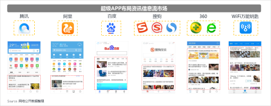对此,国外互联网巨头已尝甜头。Feed流广告作为Facebook核心收入构成,贡献超过60%的广告营收。Instagram用原生广告实现变现,预估17年收入达28.1亿美元。而回顾国内信息流行业,数据显示,2016年中国信息流广告市场规模已达到25.7 亿,同比增长率为89.5%。以社交、新闻、视频等为主要载体的信息流广告在2016年市场份额达到11.2%。百度、阿里、搜狗、360等互联网公司不甘放弃“资讯信息流”这一重要流量入口以及信息流广告的可观营收,另辟蹊径,全力追赶。各家以旗下的超级APP,切入资讯信息流市场。很多大流量的工具类App都各自展开了资讯内容的推广和信息流广告的布局。