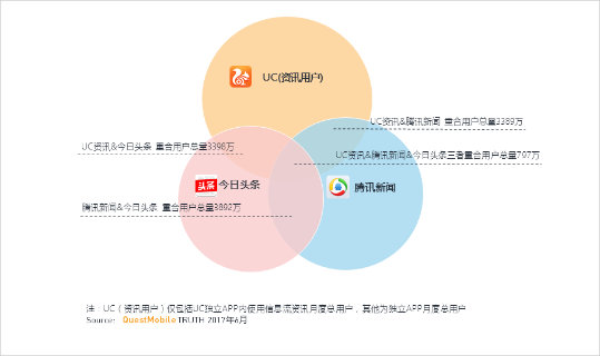 数据显示,UC资讯月度总用户达到2.28亿,日均用户超过6000万。从用户规模来看,UC资讯用户体量已接近腾讯新闻和今日头条。在综合资讯行业竞争日益加剧的背景下,UC资讯凭借庞大体量跻身综合资讯行业第一梯队。同时从用户重合度的角度来看,UC资讯的独占用户数超过了73%,与另两个平台用户重合度并不高。也就是说,这一部分的用户更多的是资讯行业用户增量。