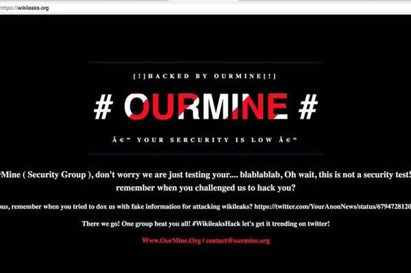 被篡改的网站上写着:“嗨,我们是OurMine,别担心,我们只是在测试你们的……哦,等一下,这可不是安全测试。维基解密,还记得你们曾经挑衅我们,让我们入侵你们吗?”