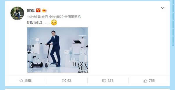 图片中,雷军一脚踏着电动滑板车,身旁背景布置则放着各式各样小米自家的产品,如小米手机、小米电脑、小米平衡车、小米电饭煲等。雷军还配文“明明可以...”,给网友留下了很大想象空间。这是要表示自己明明可以靠颜值吃饭,非要用实力吗?