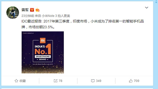 雷军发微博称,IDC最近报告:2017 年第三季度,印度市场,小米成为了排名第一的智能手机品牌,市场份额23.5%。 此外,据IDC数据统计,小米在印度市场占有率从 2017 年Q2 的17.2%成长到23.5%,并成为印度地区年增长率最快的智慧型手机品牌。