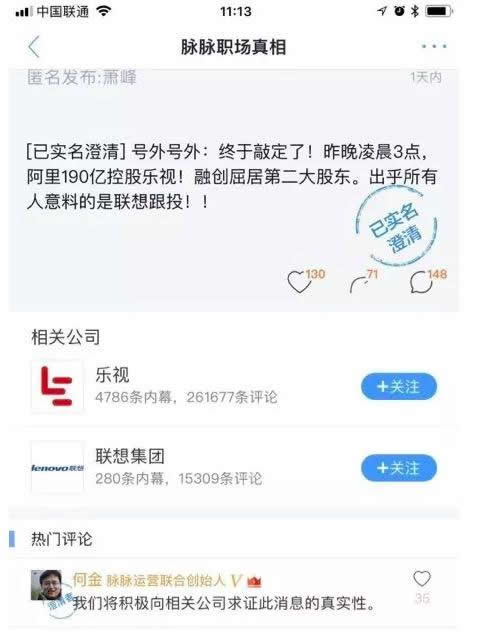 脉脉网友爆料称,“终于敲定了,昨晚凌晨 3 点,阿里 190 亿控股乐视!融创屈居第二大股东,出乎所有人意料的是联想跟投。”